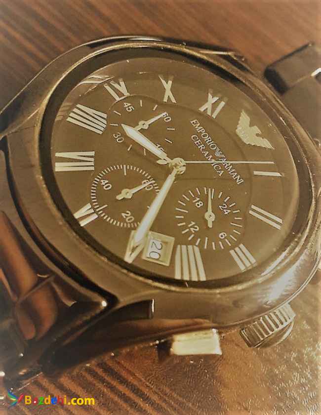 ساعت مچی Emporio Armani یک ساعت مچی با طراحی خارق العاده است. این محصول بند سرامیکی مشکی رنگ دارد و قاب آن از استیل ضد زنگ مشکی طراحی و ساخته شده است. صفحه مدرج کرونوگراف که به رنگ مشکی است با اعداد رومی نقره ای مدرج شده است. صفحه نمایش ساعت همچنین دارای لوگو و تاریخ نما و سه صفحه مدرج کوچک جداگانه است. این ساعت با نیروی محرکه کوارتز کار می کند و تا عمق 30 متری زیر آب مقاوم است.