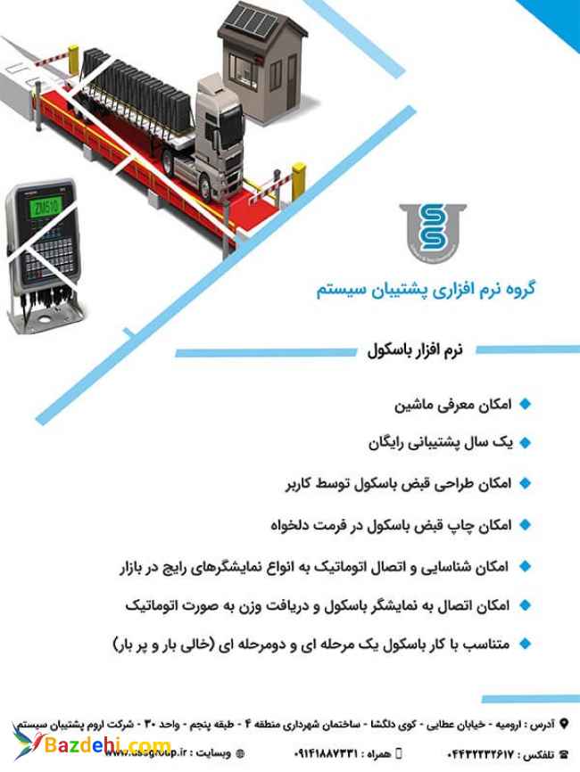 این نرم افزار برای باسکول های عمومی و جاده ای طراحی شده است . هدف از تولید این نرم افزار سرعت بخشیدن و آسان نمودن عملیات توزین توسط کاربر می باشد. 1.معرفی ماشین و تجهیزات با امکان تعیین مشخصات آن ( نوع ماشین , خالی بار)... , 2.امکان توزین یک مرحله ای و 2 مرحله ای و متفرقه و چاپ برگه باسکول آن 3.امکان تعریف کرایه حمل , هزینه باسکول , هزینه بارگیری برای هر توزین 4.امکان توزین دستی ( بدون اتصال به نمایشگر باسکول) 5.امکان تهیه گزارشات توزین به صورت روزانه , ماهانه , ساالنه 6.امکان تهیه لیست توزین های یک ماشین و یا یک کاال 7.امکان تعریف درصدهای ارزش افزوده و اعمال آن در رسید های توزین 8.امکان اتصال به انواع نمایشگر های باسکول رایج در بازار و تنظیم آن توسط خود کاربر 9.امکان تعریف کاربر در سیستم و تعیین سطح دسترسی برای هر کدام 10.امکان تهیه گزارش از میزان کارکرد صندوق برای هر روز 11.امکان طراحی گزارشات و برگه های باسکول توسط خود کاربر