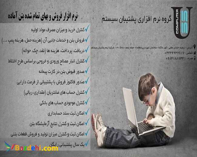 نرم افزار فروش و بهای تمام شده بتن پشتیبان سیستم این نرم افزار مخصوص کارخانجات تولید بتن آماده طراحی و تولید شده است. عملیات خرید مصالح، فروش بتن، خدمات، انبار مصالح، انبار تجهیزات، دریافت و پرداخت، هزینه، ... در این نرم افزار پیش بینی شده است. امکانات نرم افزار امکان تعریف مشتریان و گروه بندی امکان تعریف کالا و خدمات ) بتن، هزینه حمل، هزینه پمپاژ، ... ( امکان تعریف طرح اختلاط بتن برای محاسبه موجودی مصالح امکان تعریف قرارداد فروش بتن و خدمات برای مشتریان امکان ارتباط با انواع نمایشگرهای باسکول رایج در بازار امکان ثبت باسکول خرید مصالح و چاپ قبض باسکول امکان ثبت باسکول فروش بتن و چاپ قبض باسکول عادی و چاپ کارت پیمانه امکان ثبت باسکول بتن برگشتی امکان ثبت باسکول متفرفه امکان ثبت قبوض باسکول به دو صورت دستی و سیستمی امکان ثبت خدمات به قرارداد ) هزینه پمپاژ، هزینه حمل بتن، هزینه مواد افزودنی بتن ( امکان ثبت فاکتور فروش بتن و خدمات ) واحد تن یا متر( امکان چاپ فاکتور فروش به صورت عادی و فرمت دارائی امکان کسر از موجودی مصالح بر اساس طرح اختلاط بتن امکان ثبت اول دوره موجودی مصالح و تجهیزات امکان نگهداری انبار تجهیزات و ثبت عملیات خرید، مصرف، برگشت، .... امکان ثبت اطلاعات برای آزمایشگاه بتن برای هر قرارداد امکان ثبت دریافت و پرداخت و هزینه ها )نقد، چک، واریز بحساب، انتقال بین حسابها ( امکان ثبت هزینه های حقوق پرسنل امکان ثبت اول دوره صندوق و حساب