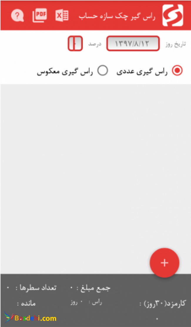 نرم افزار راس گیر چک رایگان سازه حساب نسخه نرم افزار راس گیر چک رایگان سازه حساب با محاسبات دقیق و رابط کاربری آسان، برای محاسبه سود چک بر مبنای تاریخ وصولی مورد استفاده قرار میگیرد. از جمله امکانات آن را می توان به موارد زیر اشاره کرد: رابط کاربری ساده امکان محاسبه به ۲ صورت راس گیری عددی و راس گیری معکوس خروجی به صودت Excel خروجی به صورت PDF