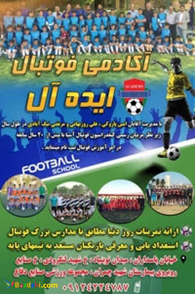 آکادمی باشگاه فرهنگی ورزشی فوتبال شماره ثبت مجوز آکادمی ما 206/8845 بزرگ ترین و مدرن ترین باشگاه ورزشی در تهران: ارائه کلیه لوازم فوتبال اعم از : لباس ،کتانی ،ساق ،قلم بند ،توپ ارائه پایان نامه معتبر از باشگاه دارای مربیان مجرب و معتبر استفاده از بازیکنان در تیم باشگاهی دارای مدرک مربی گری آكادمى فوتبال ايده آل با بيش از ٢٠ سال سابقه در امر آموزش فوتبال ميباشد كه طى اين سالها فعاليت خود را در سه شعبه به انجام رسانده سابقه درخشان با همکاری مجرب ترین کادر ورزشی و همچنین به روزترین وسایل کمک اموزشی از علاقمندان به ورزش فوتبال ثبت نام به عمل می اورد آدرس ۱ خیابان پاسداران ، میدان نوبنیاد ، ورزشگاه صنایع دفاعدرس لواسان ،جاده كمربندى ورزشگاه شهداى لواسان آدرس ۳ پاكدشت بلوار على ابن ابيطالب ورزشگاه على ابن ابيطالب انجام داده است