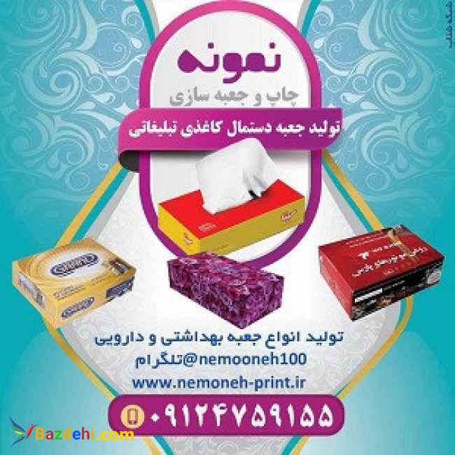 مجموعه طراحی ، چاپ و سلولوزی نمونه با تجربه 20 ساله ، متخصص ترین مرکز تولید و عرضه انواع دستمال کاغذی تبلیغاتی و اختصاصی و عمومی می باشد ، سفارش شما حداکثر ظرف مدت یک هفته با بهترین کیفیت تولید و تحویل خواهد شد . دستمال کاغذی های تبلیغاتی میتواند بعنوان بهترین هدیه قابل نمایش برای معرفی هتل ها ، کارواش ها ، تعویض روغنی ها ، بیمارستان ها ، شرکت های بیمه ، خودروسازها و شرکت های مختلف باشد . جهت رویت نمونه تولیدات به وب سایت www. Nemoneh-print.ir و یا کانال اینستاگرام https://instagram.com/Nemooneh.print برای تعرفه درخواست به کانال تلگرام پیام بفرستید nemooneh100@ آدرس : تهران _ تقاطع جمهوری و ولیعصر -جنب فروشگاه رفاه - پلاک 751 تلفن ثابت1 : 66979102 تلفن .ثابت2 : 66979105 فکس : 66976574 همراه : 09124759155 09906310043