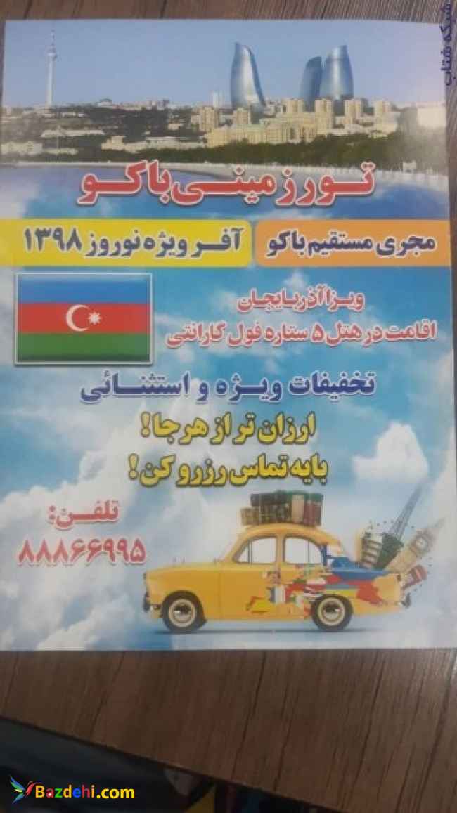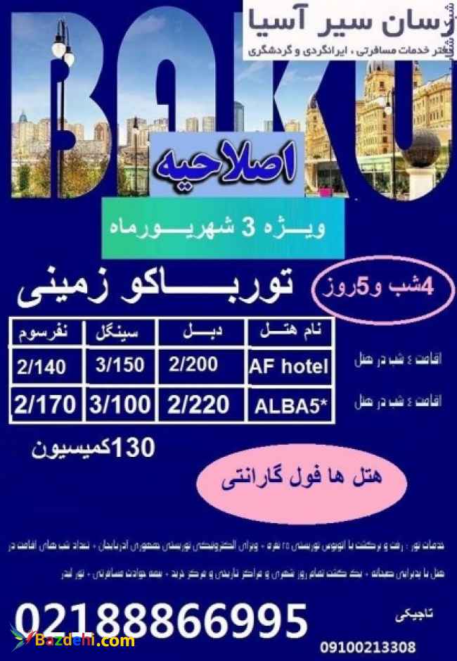 تور باکو شامل ۳ شب و ۴ روز اقامت استخر سونا جکوزی صد قدمی ساحل دریا گشت شهری کامل موسیقی زنده ویزا اتوبوس وی آی پی ۲۵ صندلی بیمه مسافرتی سامان لیدر تور از مبدا پیش فروش هتل های اواخر تابستان سراسر دنیا تورهای داخلی : مشهد ، کیش و قشم تورهای خارجی : استانبول ، آنتالیا ، وان ، باکو ، ترابزن ، ارمنستان ، گرجستان ، دبی ، تایلند ، چین و هند تور باکو زمینی ویژه ۳ شهریور ماه ۴ شب و ۵ روز ، هتل ها فول گارانتی خدمات تور : رفت و برگشت با اتوبوس توریستی ۲۵ نفره ، ویزای الکترونیکی توریستی جمهوری آذربایجان ، تعداد شب های اقامت در هتل و پذیرایی صبحانه ، یک گشت تمام روز شهری و مراکز تاریخی و مراکز خرید ، بیمه حوادث مسافربری و تور لیدر هتل اسپرینگ فول گارانتی رسان سیر اسیا ۵۰ اتاق این هتل دارای ۱۲ سرسره ابی ، بزرگترین زمین تنیس ، پینگ پنگ ، استخر سر پوشیده ، حمام ترک ، میز بیلیارد ، باشگاه بدن سازی ، ساحل اختصاصی ، تمامی اتاق ها با بهترین ویو رو به ساحل و رو به پارک آبی ایدی تلگرام : @rasanseirasiya اینستاگرام : Rasan_seir_asia ایمیل : این آدرس ایمیل توسط spambots حفاظت می شود. برای دیدن شما نیاز به جاوا اسکریپت دارید تلفن های تماس : 09124897498 88866995 88312224_5 آدرس : هفت تیر ، خیابان کریم خان ، رو به رو ی داروخانه ۱۳ ابان ، مجتمع کریم خان طبقه اول ، واحد A12