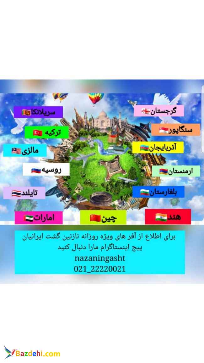 تور های داخلی مشهد -کیش-قشم-چابهار-.... تورهای خارجی ترکیه-آذربایجان-امارات-عمان-چین-ویتنام-هند--مالزی-مالدیو-فیلیپین--صربستان-آفریقای جنوبی-سنگاپور-سریلانکا-اندونزی-ارمنستان-گرجستان تور های اتحادیه شنگن ایتالیا-اسپانیا-فرانسه-هلند-سوئیس-آلمان... 021-22220021 09355048888 صفحه اینستاگرام : nazaningasht