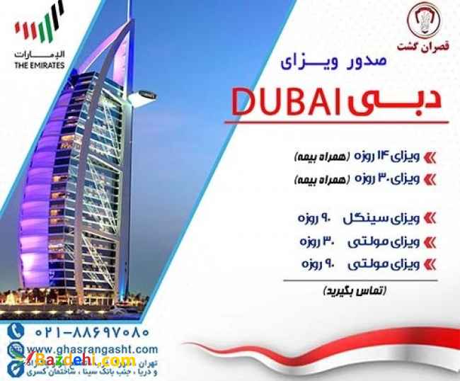 صدور ویزای دبی - آژانس قصران گشت(اخذ ویزای سینگل و مولتی دبی ) * اخذ ویزای 14 روزه * اخذ ویزای 30 روزه * اخذ ویزای سینگل 90 روزه * اخذ ویزای مولتی 30 روزه * اخذ ویزای مولتی 90 روزه ***جهت کسب اطلاعات بیشتر لطفا با ما تماس بگیرید. /نشانی سایت : www.ghasrangasht.com /نشانی پست الکترونیکی: این آدرس ایمیل توسط spambots حفاظت می شود. برای دیدن شما نیاز به جاوا اسکریپت دارید /شماره تماس:88697080-021