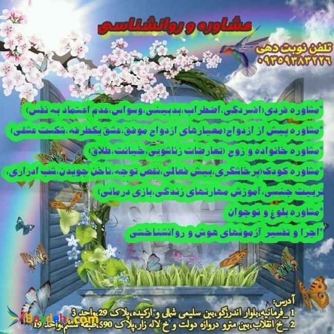 *زوج درمانی *مشاوره پیش از ازدواج *اختلالات افسردگی، استرس، اضطراب،وسواس،فوبی و ... *درمان شکست های عاطفی و وابستگی بیمار گونه *افزایش اعتماد به نفس و عزت نفس در کودکان و بزرگسالان *اجرای تست های روانشناختی *روانشناسی کودک و نوجوان(بیش فعالی،اختلال یادگیری...) *آموزش مهارتهای زندگی *بازی درمانی ✴️ ۲۰ درصد تخفیف مشاوره حضوری، #ویژه اعضای گرامی کانال. لینک کانال @Avaye_Araaam شماره نوبت دهی: 09359383226