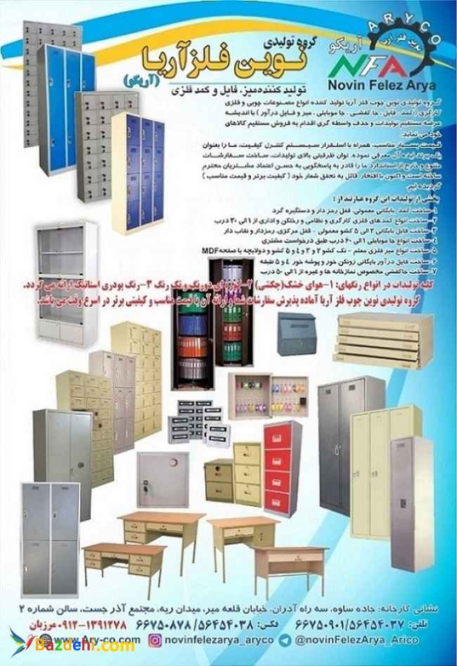 گروه تولیدی نوین فلز اریا تولیدکننده انواع محصولات چوبی و فلزی کارگری (کمد-فایل-جاکفشی-جاموبایلی-میز-دراور) بااندیشه عرضه مستقیم تولیدات و حذف واسطه گری اقدام به فروش کالاهای خود می کند. قیمت بسیار مناسب همراه با استقرارسیستم کنترل کیفیت ما را به عنوان یک برند ایده ال معرفی نموده است.توان ظرفیت بالای تولیدات ساخت سفارشات متنوع و خارج از استاندارد ما را قادر به پاسخگویی به حسن اعتماد مشتریان محترم ساخته است و اکنون با فتخار نایل به تحقق شعار خود کیفیت برتر و قیمت مناسب گردیده ایم. سایت ما: www.ary-co.com تلگرام: Novinfelezarya_arico@ اینستا: Novinfelezarya_aryco