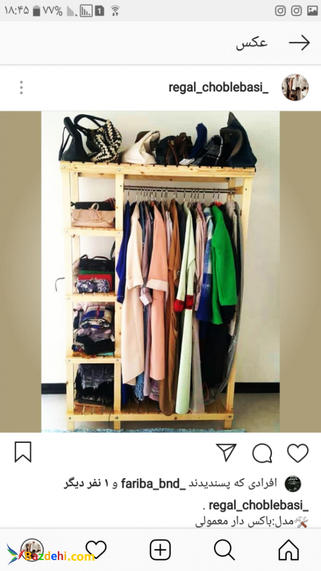رگال مدرن رگال چوبی ایستاده بدنه چوب روسی درجه یک داری تحمل وزن بالا برای آویزان کردن تمامی لباس های شما عزیزان و همچنین طبقاتی برای قرار گرفتن کیف و کفش قابل استفاده برای منازل،فروشگاه ها،آرایشگاه ها،مزون ها و... باکس دار معمولی رنگ خام چوب و فندوقی طول: 110سانتی متر قد: 170 سانتی متر عمق: 45 سانتی متر قیمت: 479 تومان یک طبقه رنگ خام چوبی و فندوقی طول: 100 سانتی متر قد: 170 سانتی متر عمق: 45 سانتی متر قیمت: 329 تومان یک طبقه سفید طول: 100 سانتی متر قد: 150 سانتی متر عمق: 45 سانتی متر قیمت: 429 تومان دو طبقه رنگ خام چوب و فندوقی طول: 100 سانتی متر قد: 170 سانتی متر عمق: 45 سانتی متر قیمت: 379 تومان قیچی،خام چوب و قهوه ای سوخته طول: 80 سانتی متر قد: 160 سانتی متر عمق: 45 سانتی متر قیمت: 379 تومان باکس دار ویژه خام چوب طول: 110 سانتی متر قد: 170 سانتی متر عمق: 45 سانتی متر قیمت: 529 تومان امکان تغییر رنگ در 5 تم متفاوت ارسال در تهران و اسلام شهر و شهر ری (نصب شده) بصورت رایگان ارسال ب شهر های نزدیک مثل کرج( نصب شده ) هزینه ارسال بعهده مشتری حدود به40هزار تومن ارسال ب شهرستان (نصب نشده)(نصب آن بسیار آسان میباشد) توسط تیباکس و هزینه آن درب منزل پرداخت میشود شهرستانی های عزیز به علت پرداخت هزینه تیباکس برای شما عزیزان تخفیفات ویژه داریم بعلاوه کسانی ک بیش از یک خرید سفارش بدهند تمامی عکس ها در شیپور قرار نگرفته اند لطفا با پیام به شماره زیر عکس ها را با کیفیت دریافت کنید. جهت سفارش پیام کوتاه ب شماره ی 09927825272