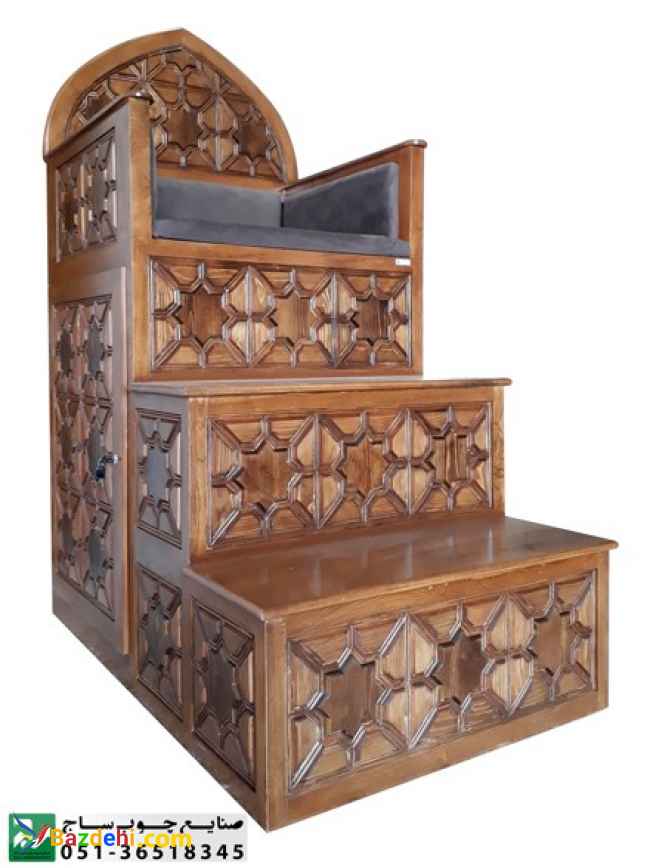 جنس چوب : گردو ، چنار قرمز ، آزاد ، راش کاملا دستساز رنگ : پلی استر جهت اطلاع از قیمت و مشخصات این محصول با ما تماس بگیرید یا از وبسایتمان دیدن فرمایید . صنایع چوب ساج | تولید کننده مصنوعات چوبی مساجد و نمازخانه ها از جمله منبر چوبی مسجد با استفاده از هنر فاخر گره چینی دست . می توان گفت منبر در تمامی ادوار اسلامی جزء ضروریات مساجد محسوب میگردید و نقش موثری در ترویج دین داشته و یکی از مهم ترین عناصر الحاقی مساجد بر ساختار معماری آن ها می باشد که اهمیت آن به جهت مشخص نمودن محل استقرار پیشوای مسلمین به منظور ارائه خطبه بوده است . ساخت منبر با ترکیب عناصر چوبی وهنر گره چینی با استفاده از نقوش هندسی ، نشان دهنده فرهنگ، عقاید و هنر اصیل ایرانی است که منجر به شکوفایی و جلوه در کناردیگرتزئینات مرتبط در ساختار مساجد می شود. همچنین به دلیل نظم و تعادل در طراحی نقوش هندسی آن منجر به ایجاد حس آرامش در هر بیننده ای میگردد. منبرها باتوجه به سلیقه مشتری بصورت دو پله، ۳پله، ۴ پله ، ۵پله ، ۷ پله و ... ارائه می گردد. ساعت کاری مجموعه: از 8 صبح الی 18